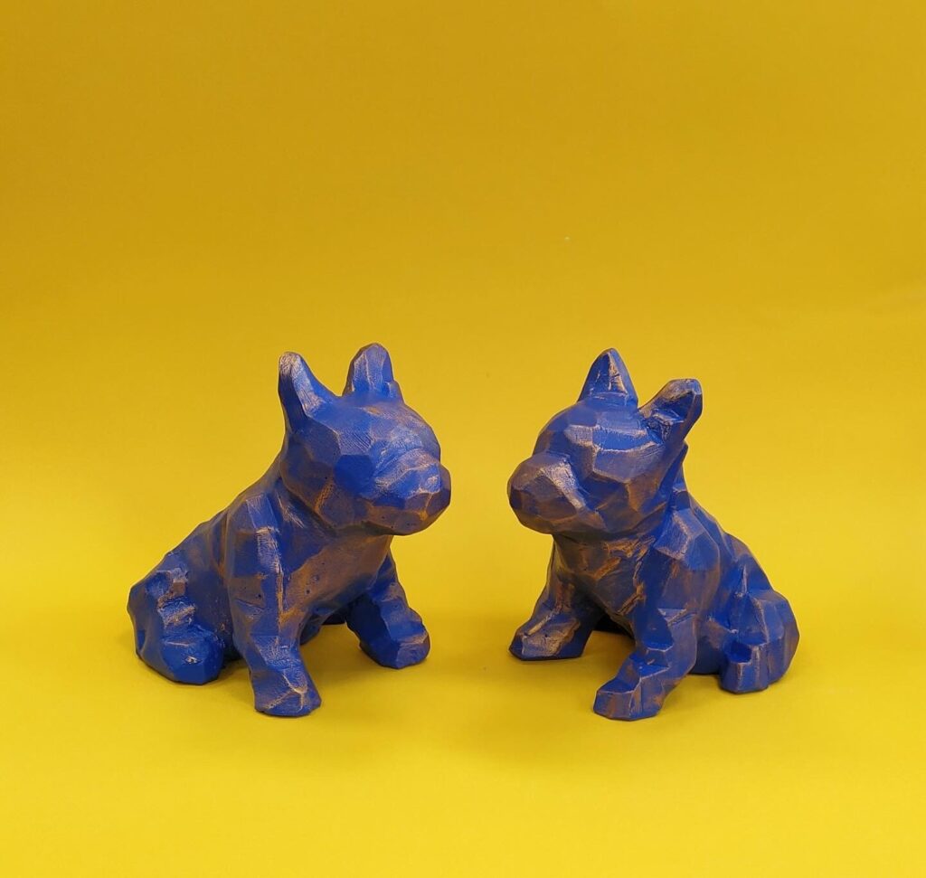 This work consists of two plaster dog sculptures created through a multi-stage casting process. The initial figurine was sculpted in clay, followed by the creation of a silicone mould supported by a plaster casing. After removing the original clay model, the resulting reusable mould was used to cast the final plaster forms. The sculptures were refined through extensive sanding and surface work, and finished with hand-applied colour and subtle gold highlights, emphasizing texture and form. 2022.